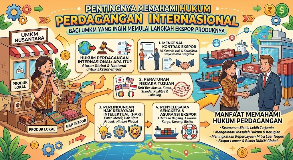 Memasuki pasar global merupakan impian bagi banyak pelaku Usaha Mikro, Kecil, dan Menengah (UMKM) di Indonesia. Keinginan untuk melihat produk lokal bersanding dengan merek internasional di rak toko mancanegara tentu menjadi prestasi membanggakan. Namun, langkah ekspor bukan sekadar mengirim barang melintasi batas negara. Di balik peluang keuntungan yang besar, terdapat labirin aturan yang dikenal sebagai hukum perdagangan internasional. Memahami aspek legal ini bukan lagi sebuah pilihan, melainkan fondasi utama agar bisnis tidak terjegal di tengah jalan.